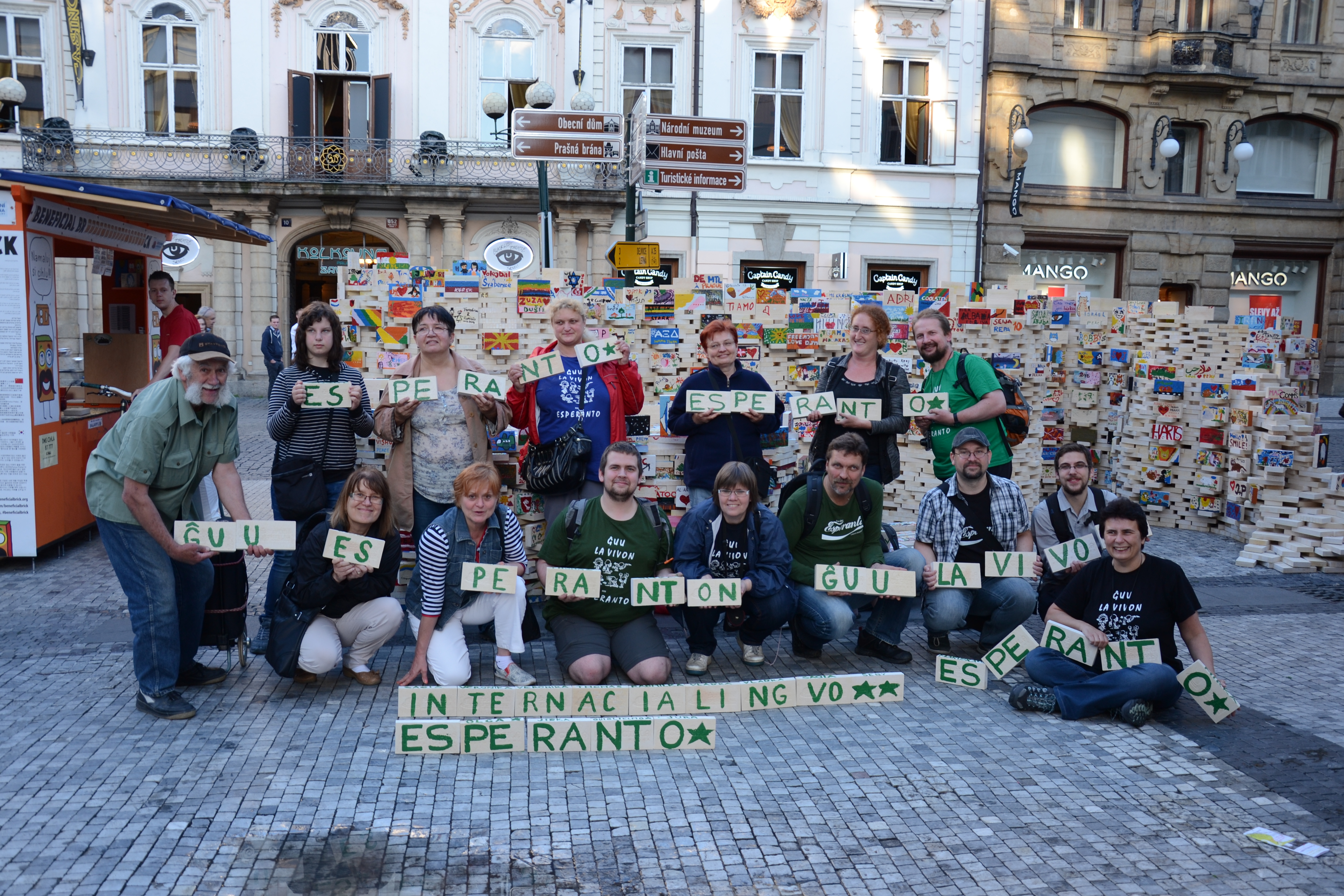 …kaj enmetitaj en simbolan muron, kiu staras meze de Prago, en la strato, kie ĉiutage trairas amasoj da turistoj, kiuj admiras la muron kaj fotas ĝin. Kun la muro ili nun ankaŭ fotas niajn Esperanto-brikojn, kaj do oni povos vidi Esperanton en diversaj mondopartoj.