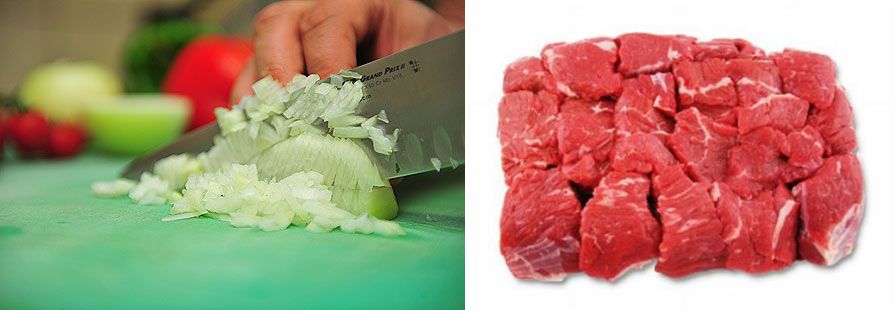 Cepojn tranĉu je malgrandaj pecetoj, ankaŭ la viandon tranĉu je ĉirkaŭ 2 cm grandaj pecetoj.