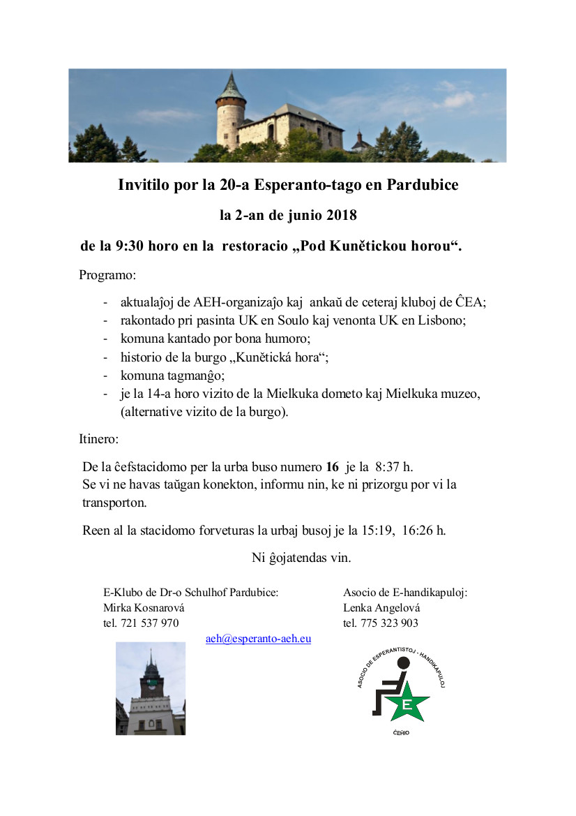 E-Klubo de Dr-o Schulhof Pardubice kaj Asocio de E-handikapuloj invitas ĉiujn por partopreni jam la 20-an Esperanto-tagon en Pardubice!
