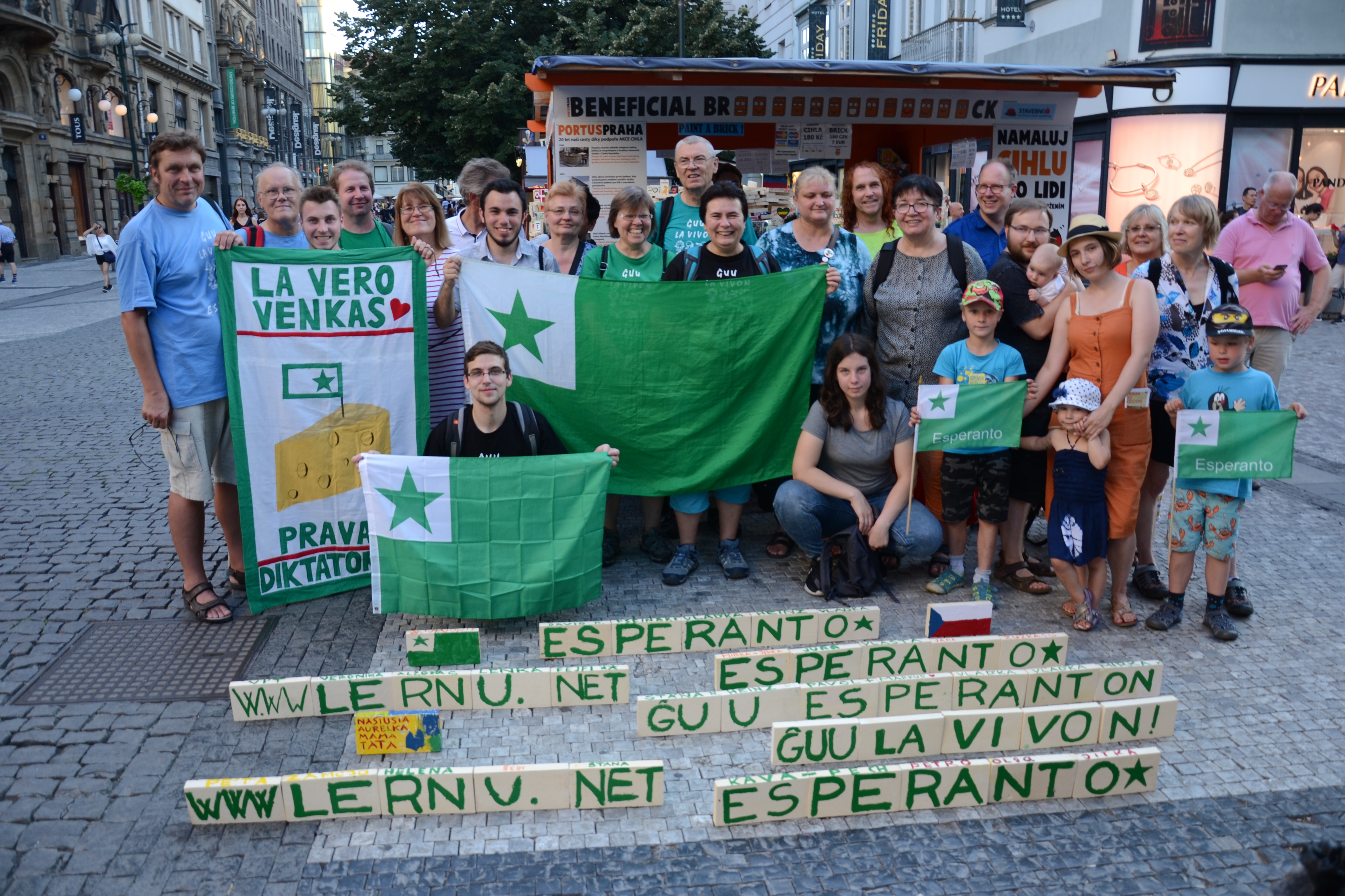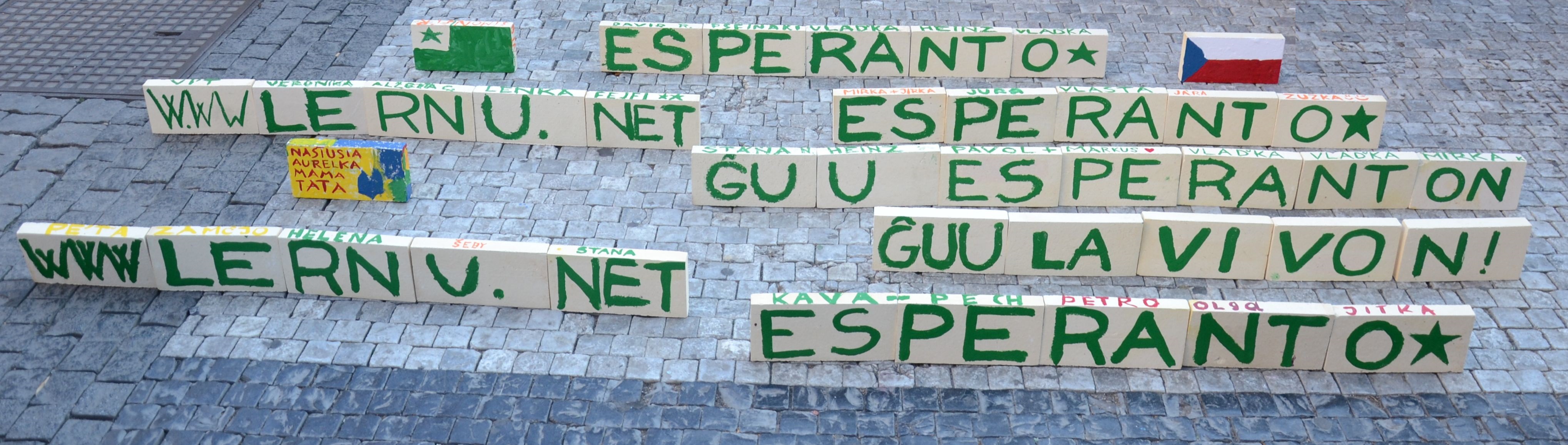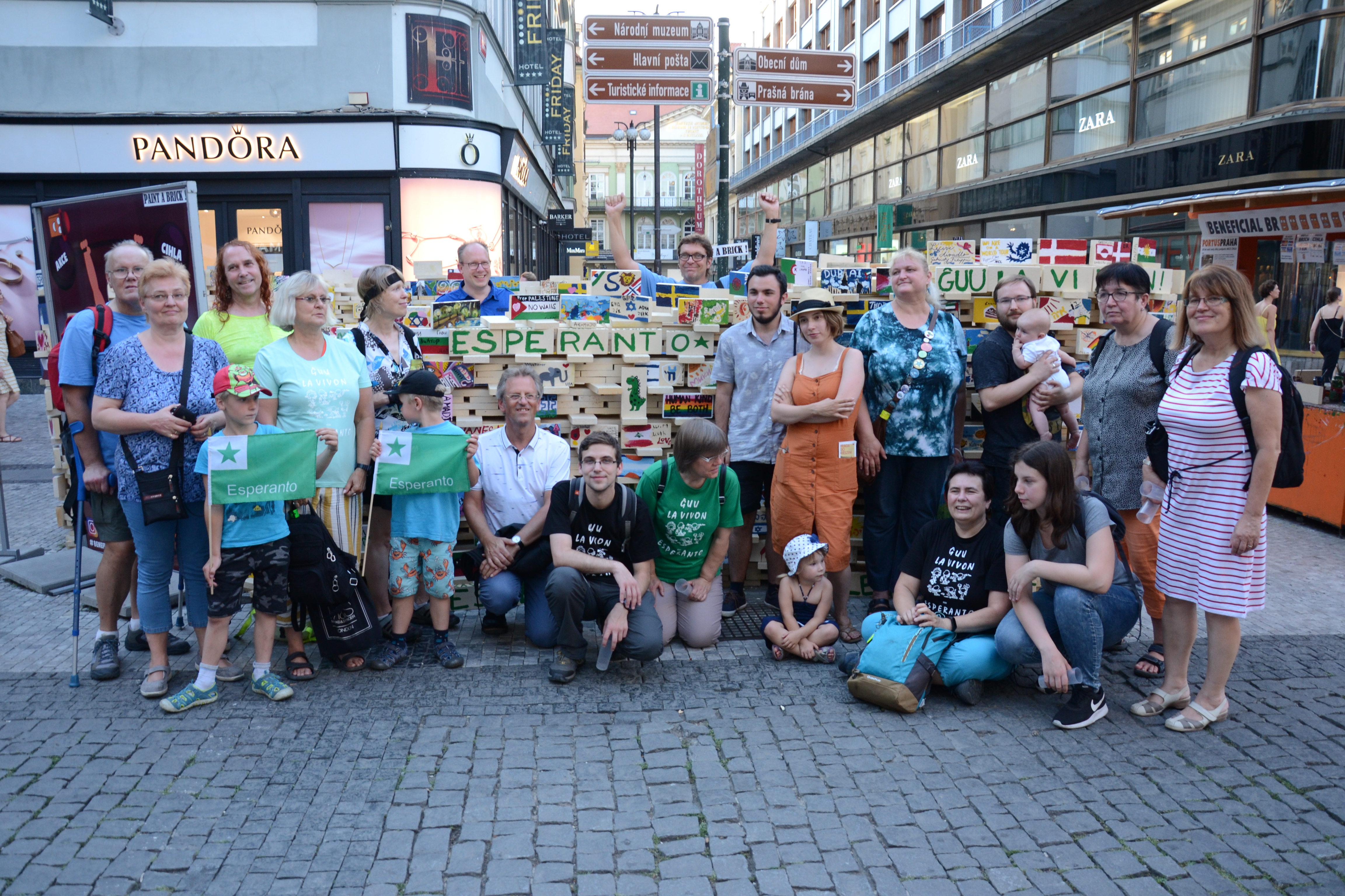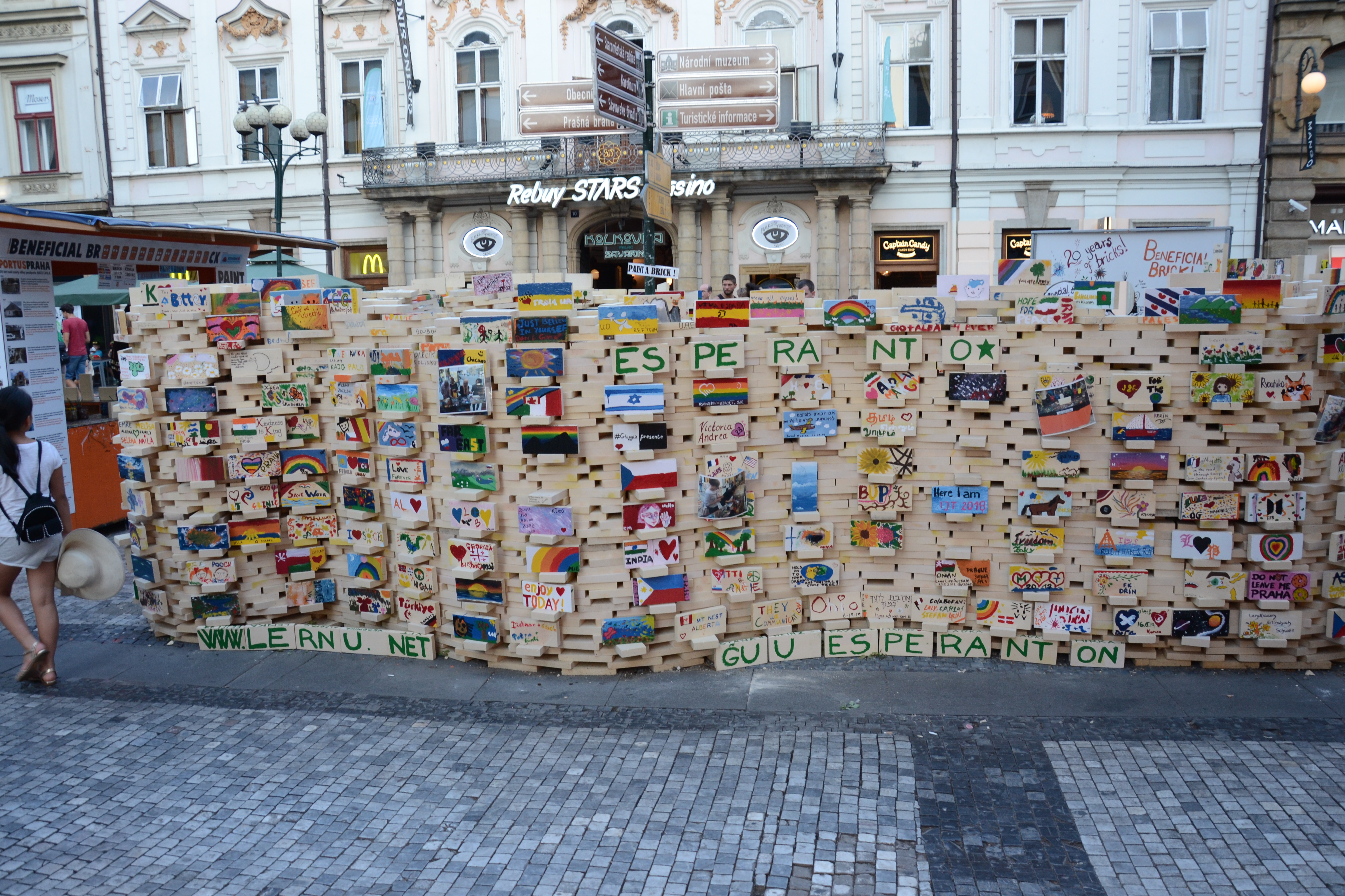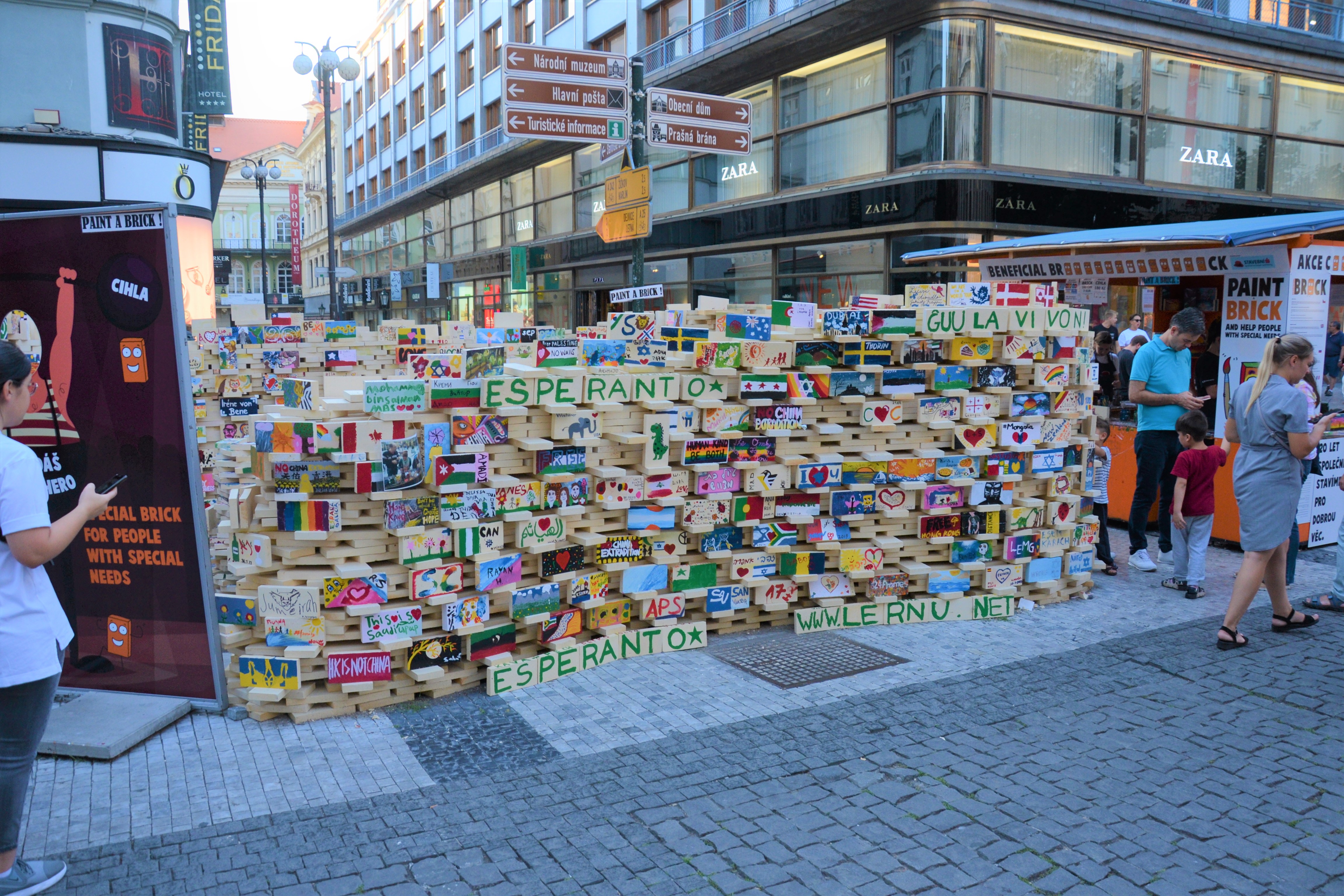 …kaj enmetitaj en simbolan muron, kiu staras meze de Prago, en la strato, kie ĉiutage trairas amasoj da turistoj, kiuj admiras la muron kaj fotas ĝin. Kun la muro ili nun ankaŭ fotas la Esperanto-brikojn, kaj tiel oni povos vidi Esperanton en diversaj mondopartoj.
