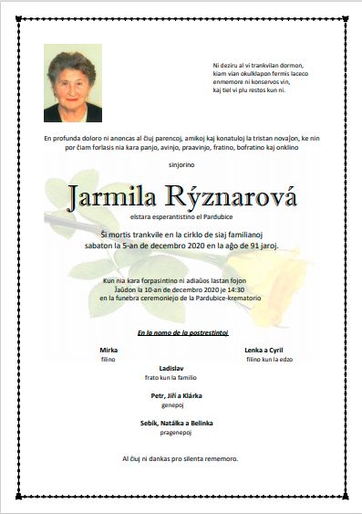 Sabate la 5-an de decembro 2020 bedaŭrinde forpasis Jarmila Rýznarová, bonkora virino kaj entuziasma esperantistino, kiu vigle gvidis klubon, organizis aranĝojn, skribis artikolojn…Krome ŝi ankaŭ estis granda favorantino de E-mental´.