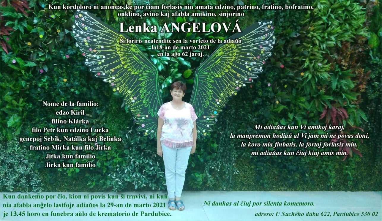 La 19-an de marto 2021 bedaŭrinde forpasis nia amikino Lenka Angelová, longjara aktiva membrino de E-mental’, tre bonkora virino, kiu zorgis pri aliuloj kaj ĝojigis homojn ĉirkaŭ si, nelacigebla persono, kiu dum multaj jaroj vigle laboris por Esperanto-mondo.