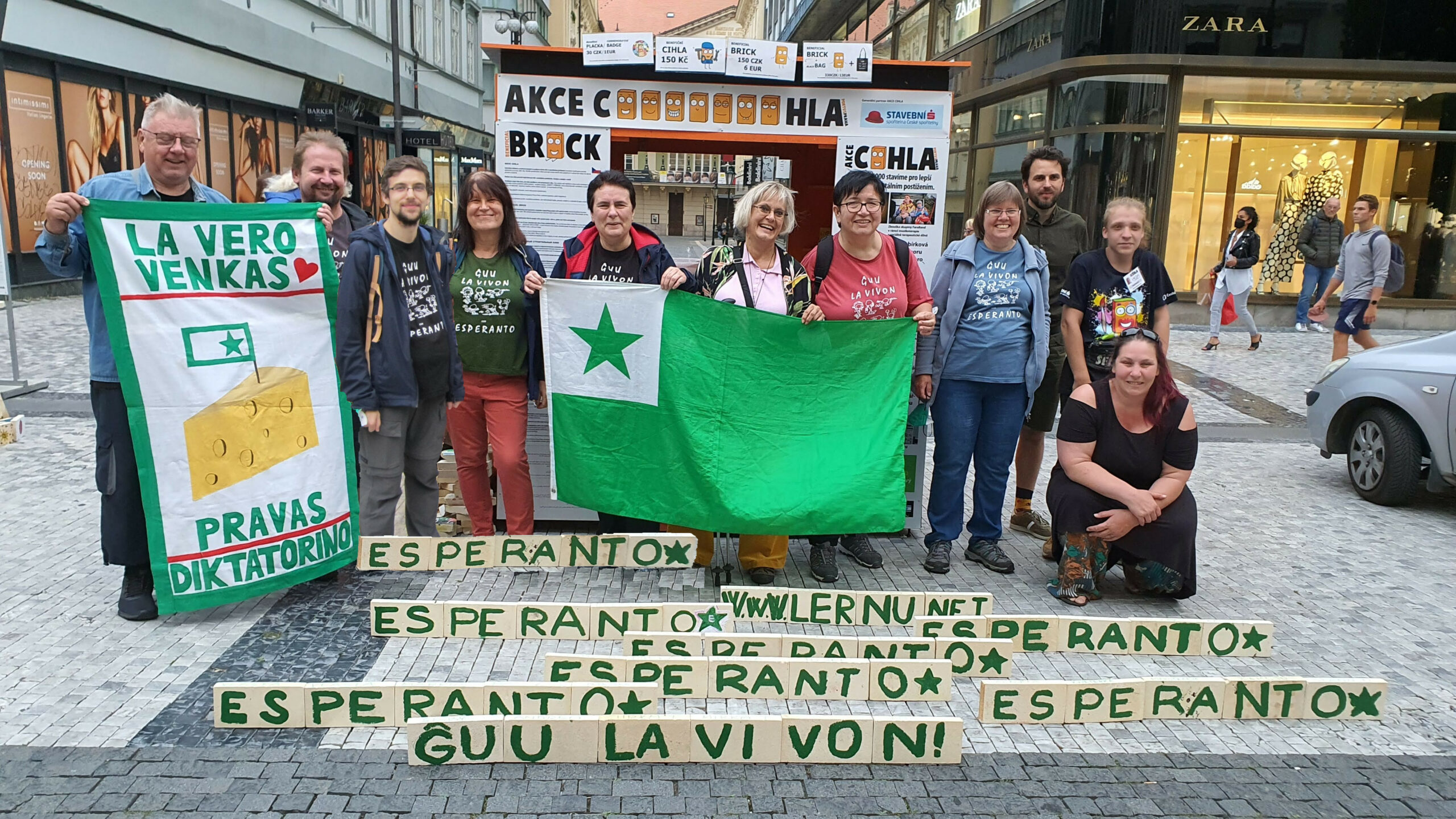 …kaj enmetitaj en simbolan muron, kiu staras meze de Prago, en la strato, kie ĉiutage trairas turistoj, kiuj admiras la muron kaj fotas ĝin. Kun la muro ili nun ankaŭ fotas la Esperanto-brikojn, kaj tiel oni povos vidi Esperanton en diversaj mondopartoj.
