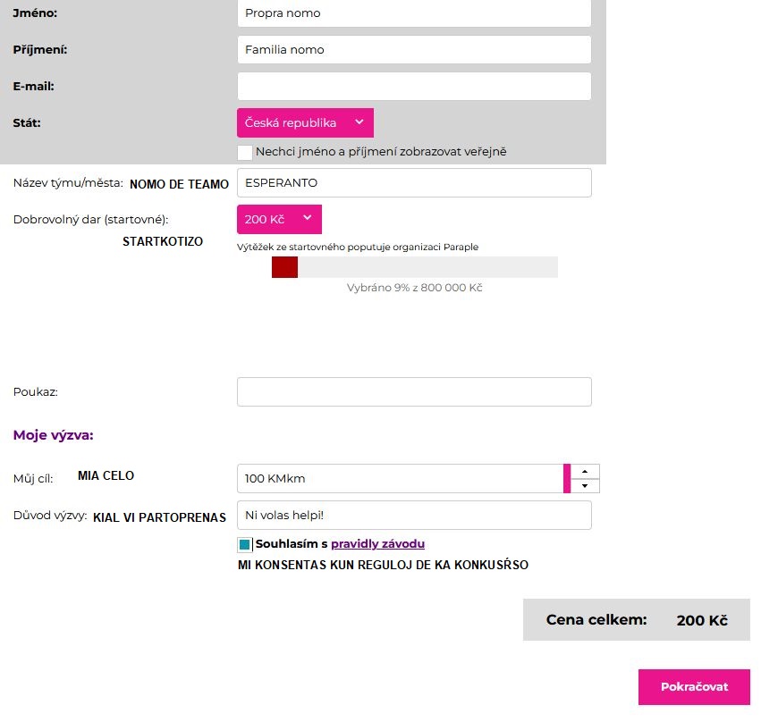 Se vi estas eksterlandano, ankaŭ vi povas helpi. Aliĝu! Partoprenkotizo, per kiu vi helpos al la handikapuloj, estas 200 kč = 8 EUR. Se vi bezonas helpon kun aliĝo, skribu al e-mentalprago(ĉe)seznam.cz