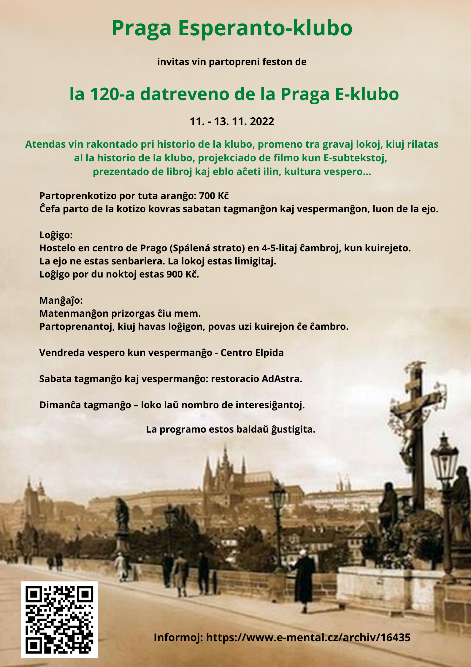 Koran dankom por la rapuda akcepto de mia aligĝilo al la festo de la 120-jariĝo de la Praga E-klubo. Mia komento: Mi alveturos al Prago la sabate matene je la 6-a horo. Tio saignifas, ke mi ŝatus tranokti en Spálená-strato nur sabate.