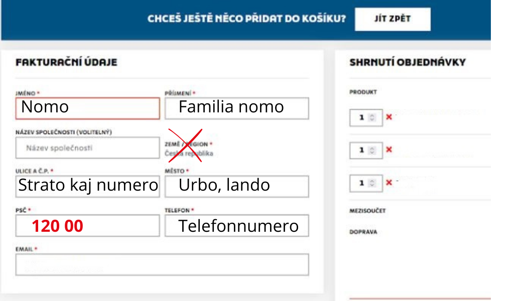 Plenigu informojn por fakturo. En la lokon por PSČ skribu 120 00.