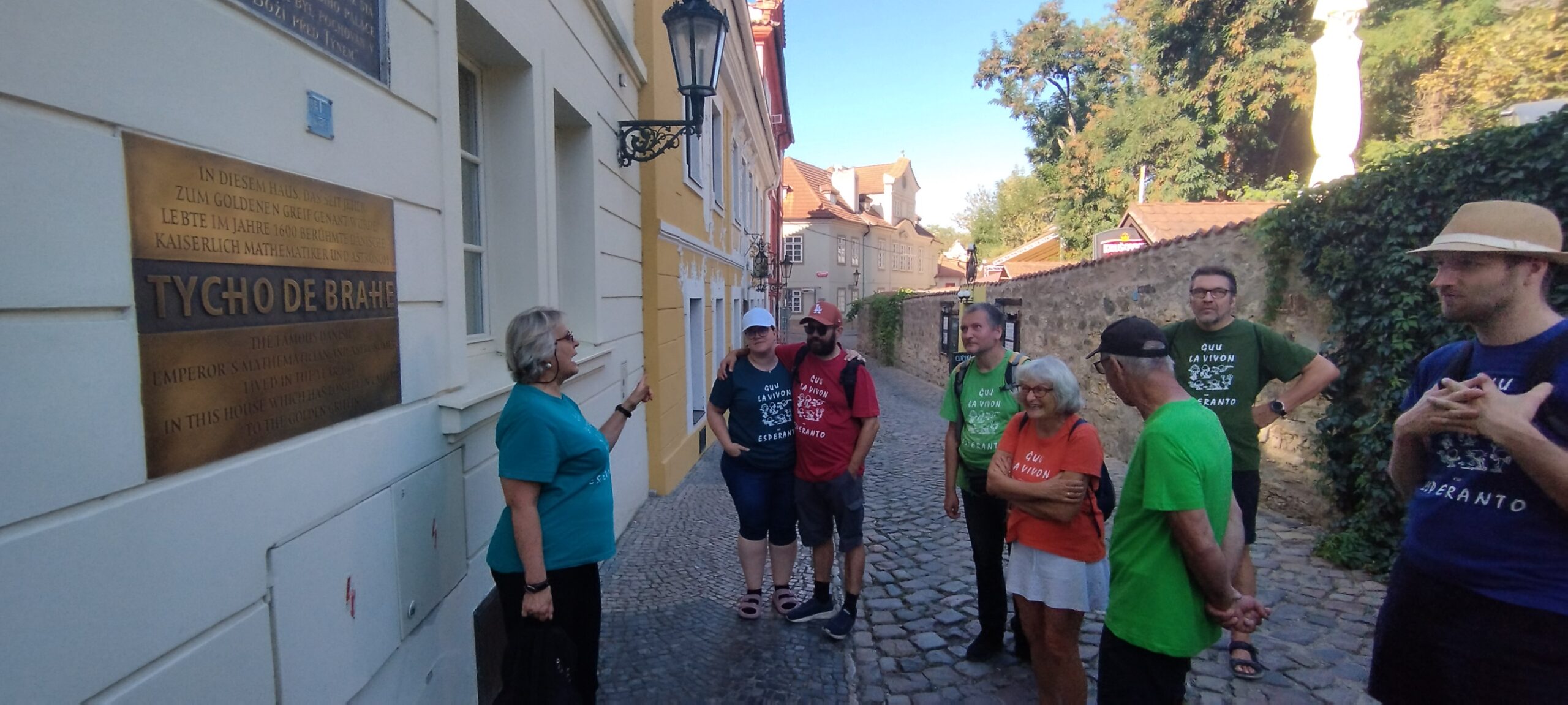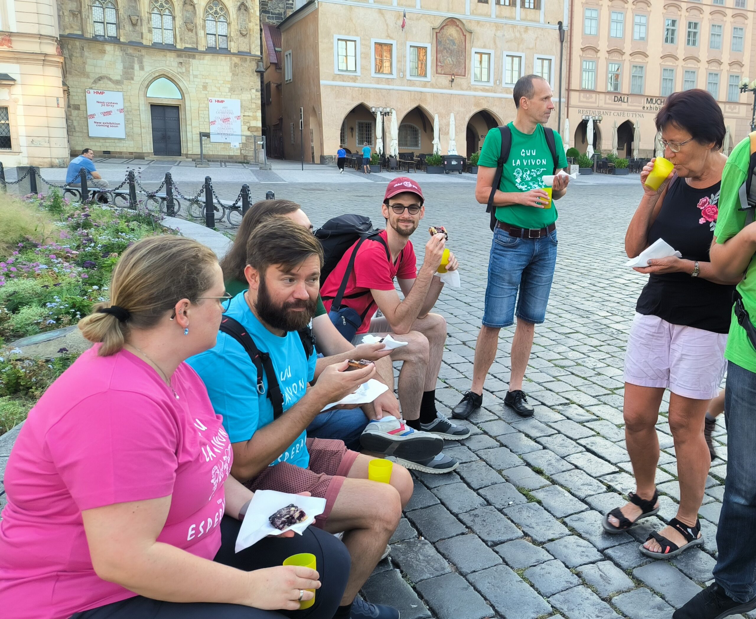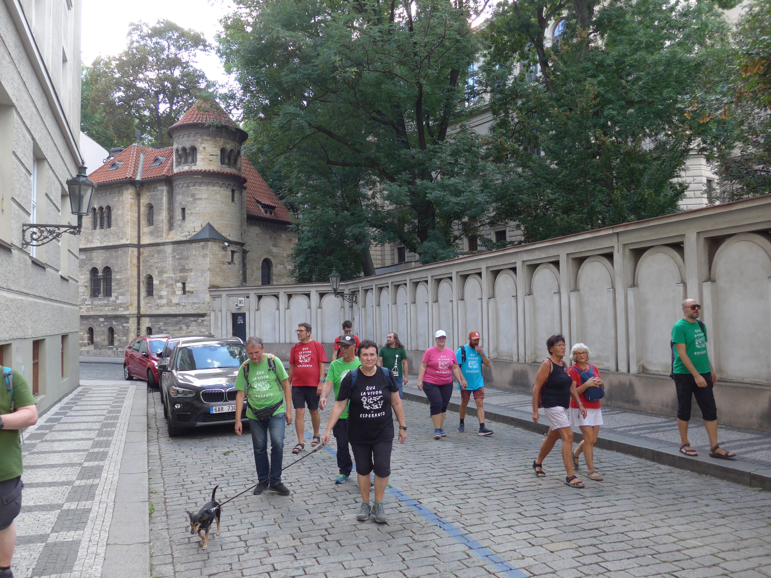 Matene jam je la sepa horo kunvenis la gastoj kaj kelkaj E-mentalanoj en centro de la urbo por kune promeni tra pragaj stratoj, kiuj matene ankoraŭ ne estas plenaj da turistoj. En Malnovurba placo estis mallonga paŭzo por formanĝi hejman kukon kun iom da kafo.