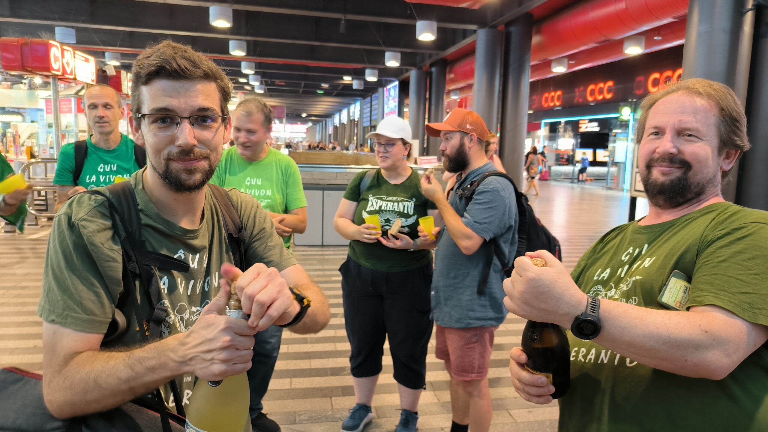 La Grazanoj venis al Prago per pli frua trajno, ol ili anoncis, do komence ŝajnis, ke estos fuŝita planita bonvenigo. Sed la bonvenigo estis replanita kaj Grazanoj estis bonvenigitaj en stacidimo du horoj post ilia alveturo. E-mentalanoj venis tra ĉefa halo de la stacidomo kun flagoj kaj veninte al la Grazanoj, kiuj atendis sur interkonsentita loko, E-mentalanoj kantis bonvenigan kanton.