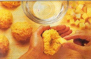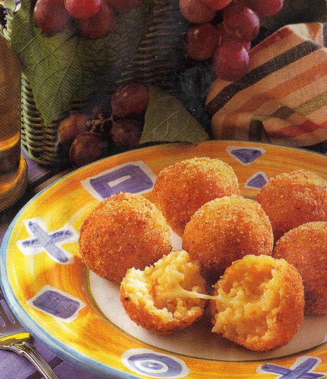 3. Po etaj kvantoj almiksu parmazanon kaj ovojn, salu kaj pipru miksaĵon. Distranĉu mozarelon je 20 kubetojn. Per malseketaj manoj kreŭ el riza materio buletojn, en kiujn enpremigu kubeton de la da mozarelo kaj denove buletigu ilin.