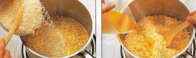 1. Degeligu buteron, aldonu cepon kaj rostadu proksimume 2-3 minutojn. Aldonu rizon iom fritu ĝin englase.