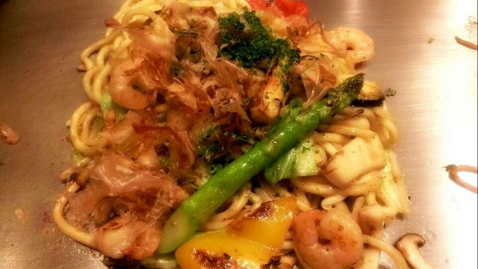 Japana manĝaĵo – frititaj nudeloj, maraj fruktoj, legomoj, ajlo