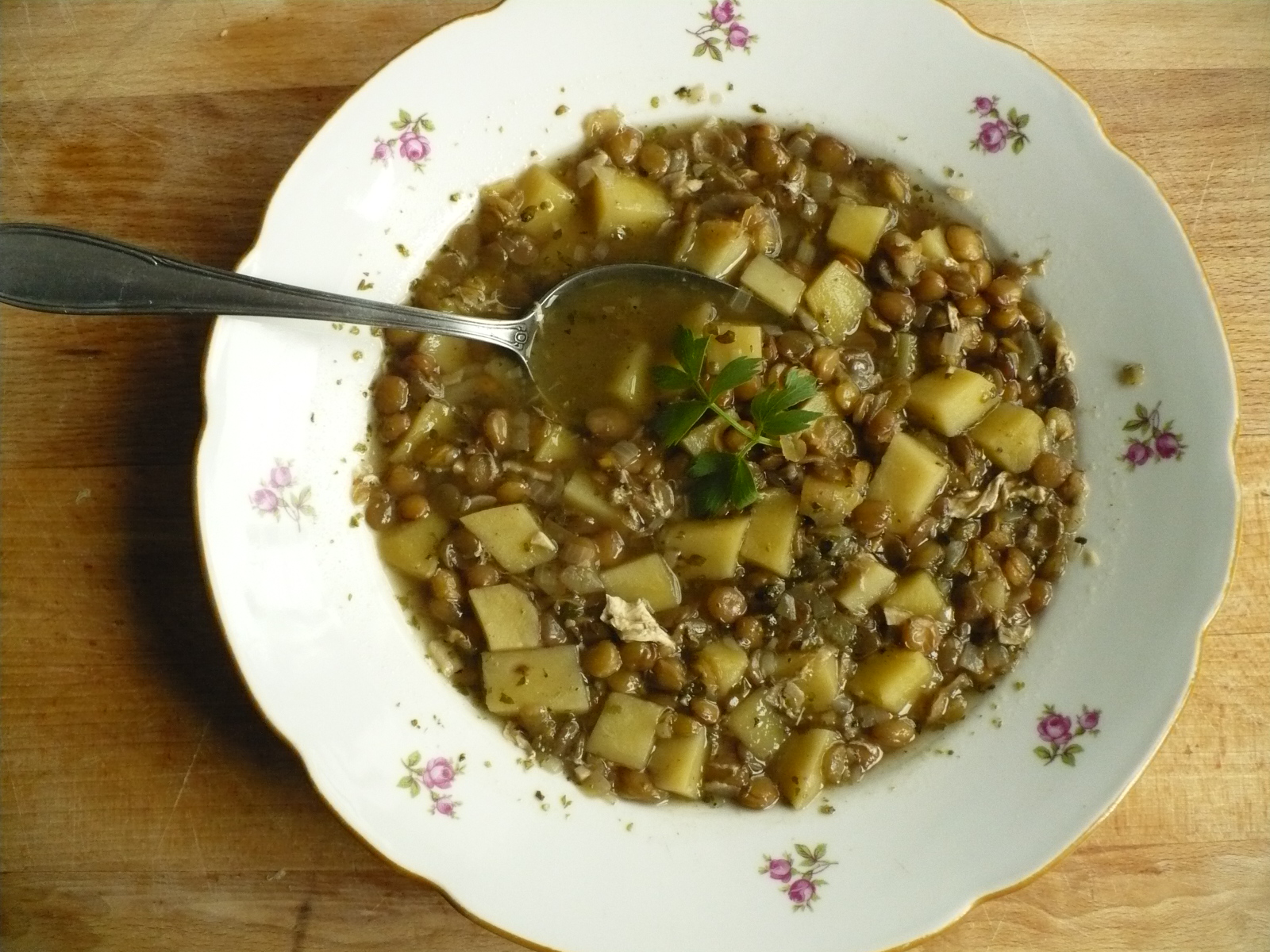Supo farita el lentoj, terpomoj, cepo, ajlo, ovo kaj spicaĵoj